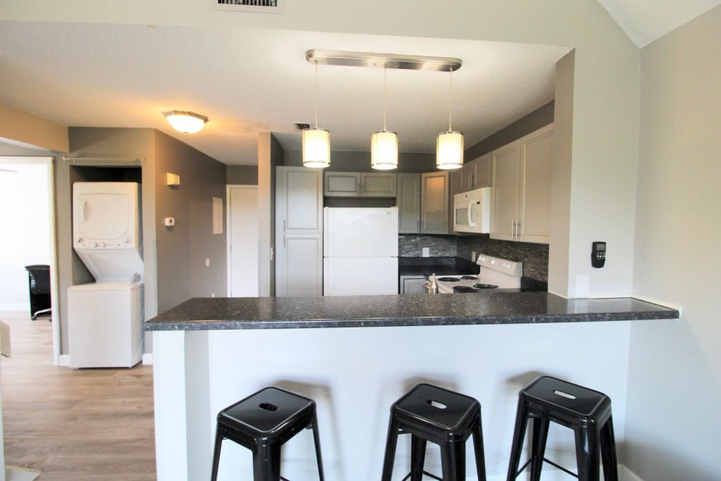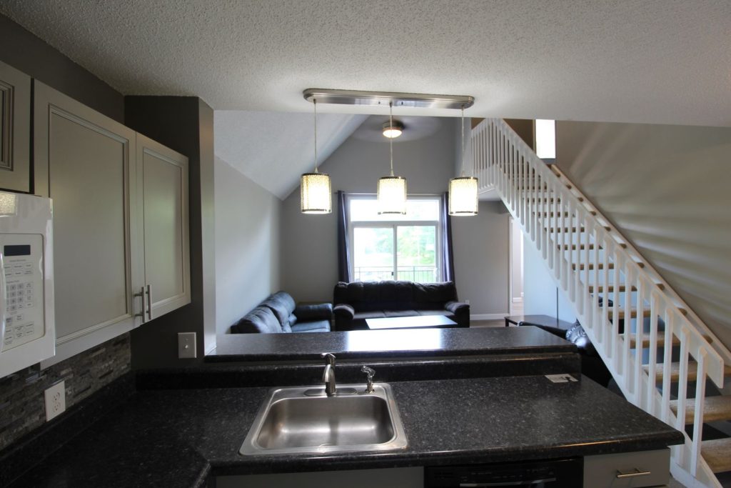 Spacious Living: Our 5-bedroom, 3-bath loft condos are all about comfort and style. The living room features a stunning two-story vaulted ceiling, creating an open and airy vibe perfect for chilling or hosting friends.